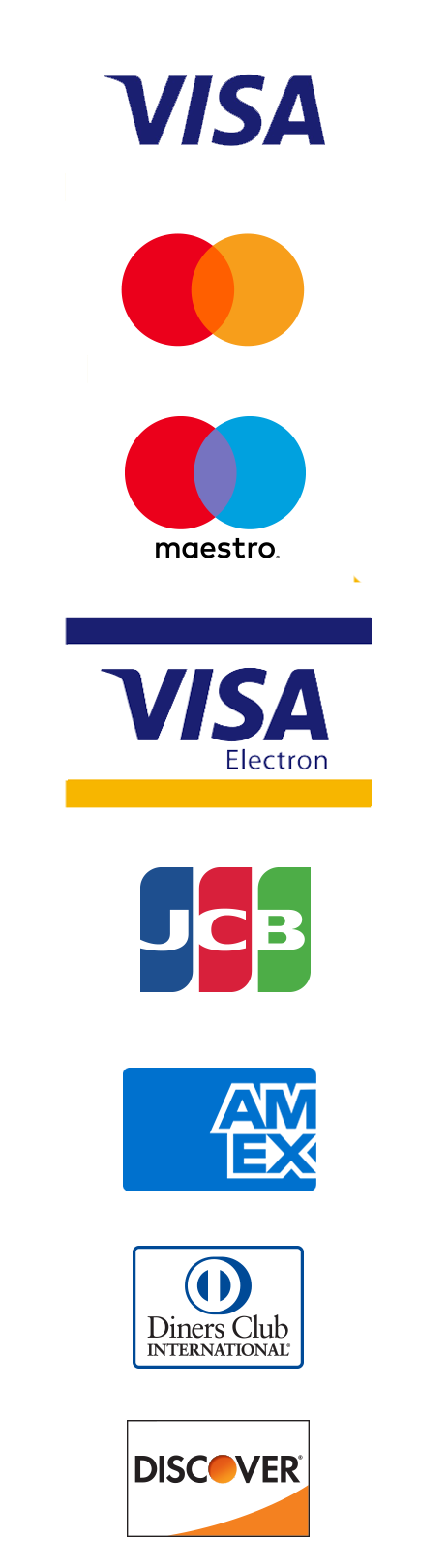 We accept four types of major credit cards (MasterCard, Visa, American Express, and Discover), as well as PayPal and Apple Pay.
